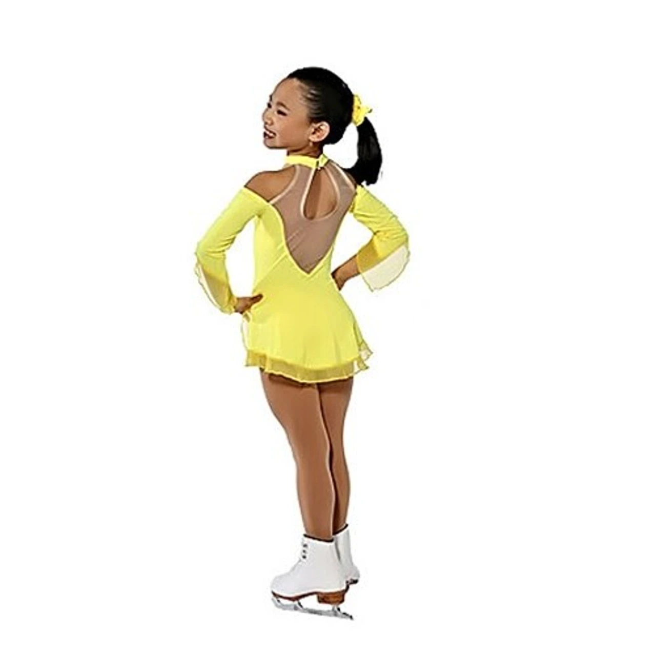 Open shoulders and back of stretch illusion mesh. 3/4 sleeves and flat skirt edged in matching mesh. Hooks at neck back. Available in Lycra or Velvet.