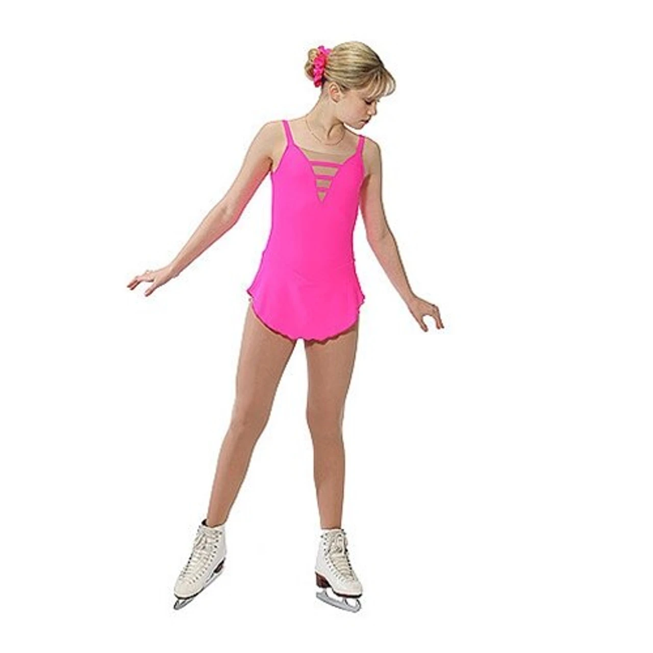 Just for fun! A new tank style with “cross bars” in bright Italian matte tricot. Front straps appear to split into double straps on the back–supported by nude mesh insert. Cross bars and straps in matching lycra are supported with double-layer nude stretch illusion mesh for stability. Matching lettuce-edge lycra skirt with closed sides.