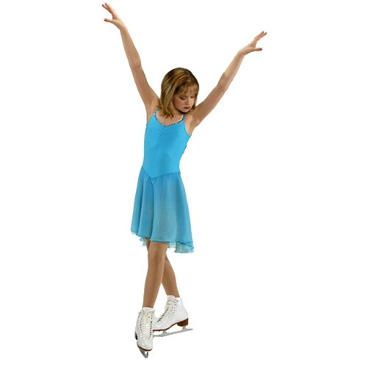 A slip of a dress with dramatic woven-strap back—perfect for your dance routine. Camisole lycra or velvet bodice and double-layer mesh skirt with split back opening. Bodice is lined.