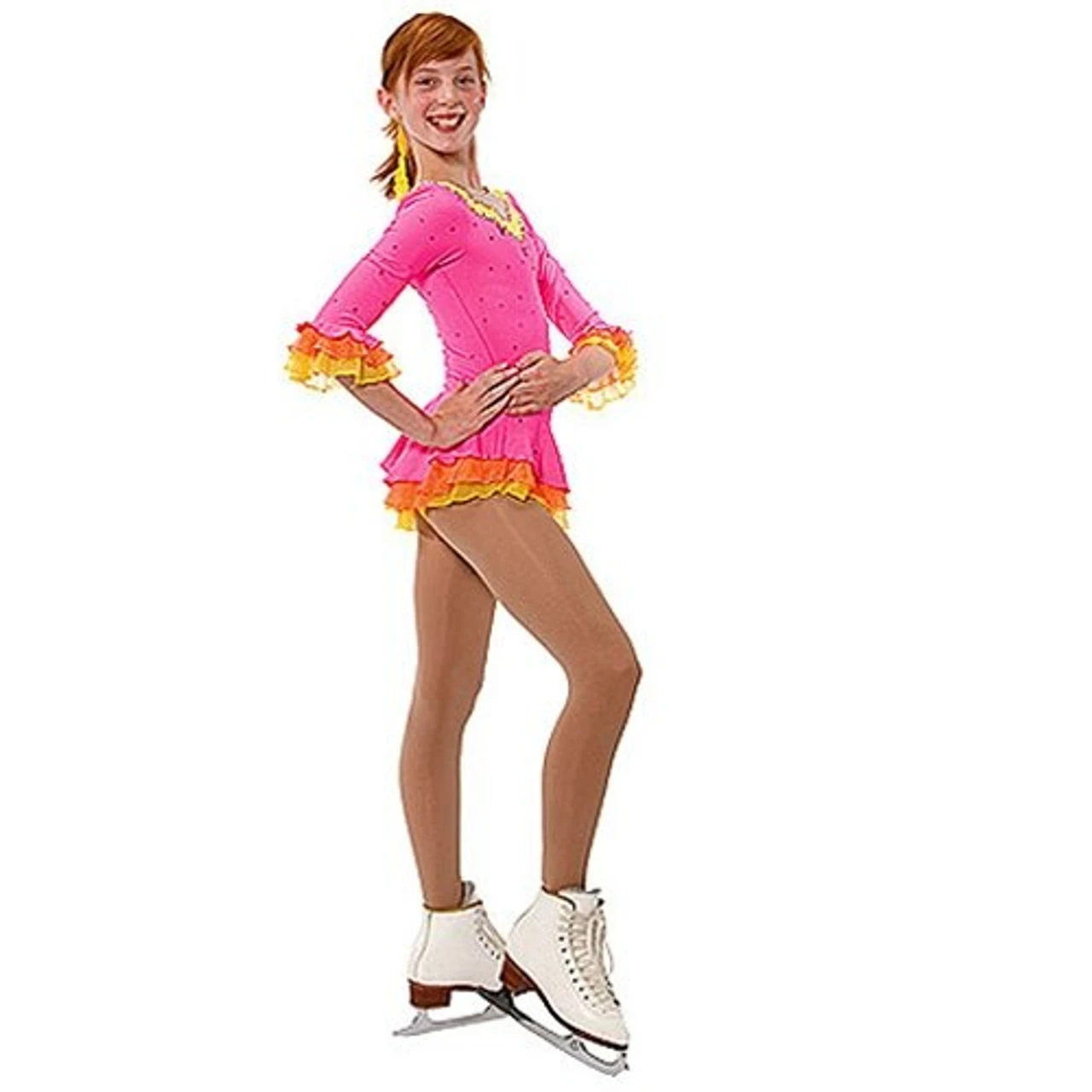 Bright & sassy for your flaminco or Spanish program. Scalloped front and back neckline and 3/4 ruffle sleeves–incredible on the ice. Traditional skirt with contrast underskirt.