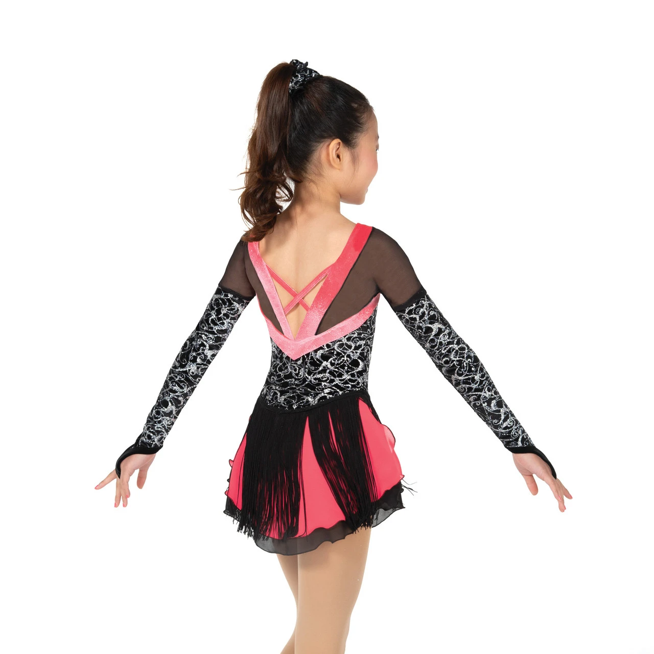 Ritzy silver swirled glitter velvet dress with long glove style sleeves with finger points, contrast shimmer velvet accents and a layered skirt with a swishy fringe overlay.