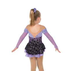 Two tones of purple are better than one, so this dress pairs deep purple velvet with a soft iris shade and a dainty pattern of silver glitter. Sweetheart neckline, glove style mesh sleeves and a double skirt.