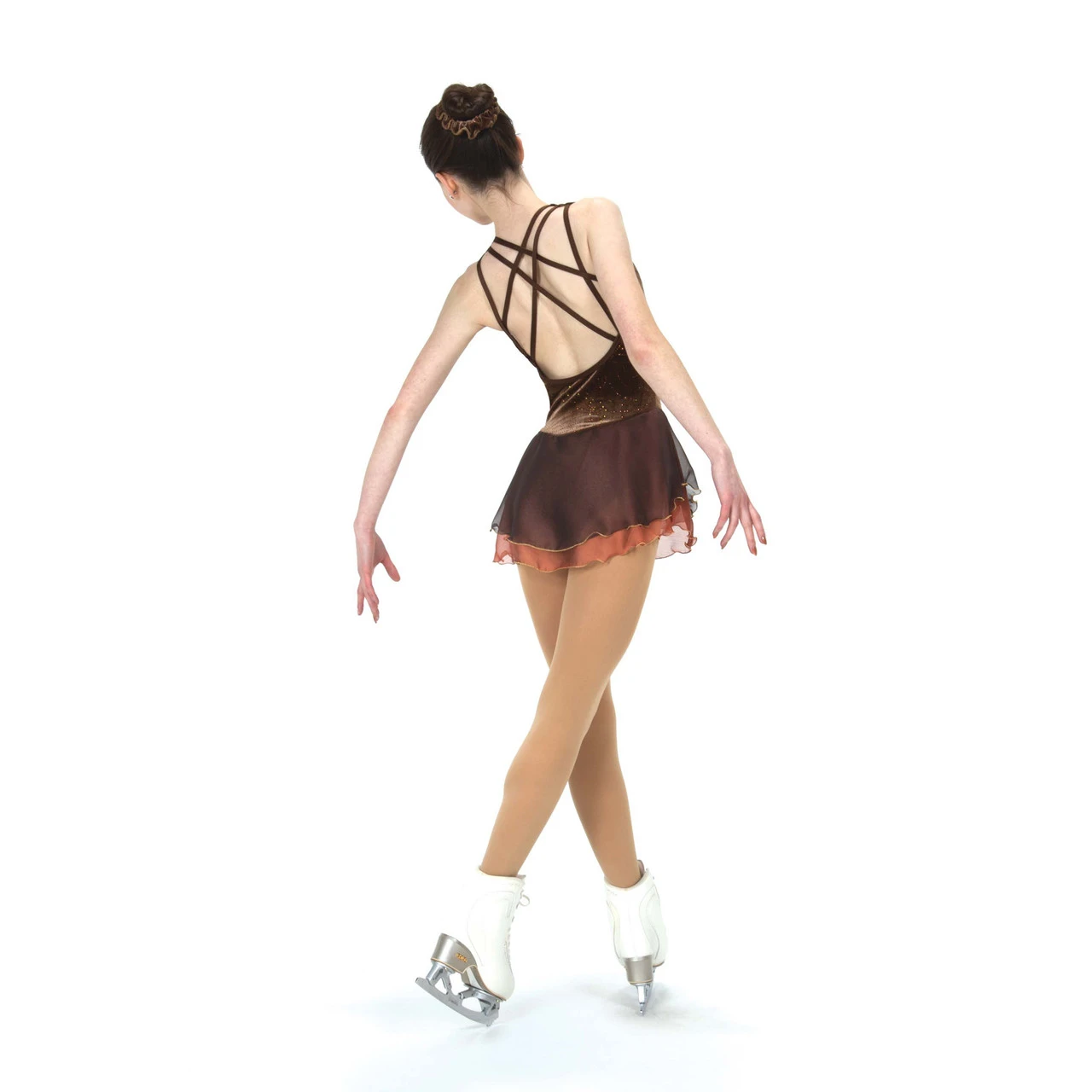 A rich brown dress brushed all-over with bronze glitter. Accents include copper sequin trim at the V-neck, a shimmery bronze linen chiffon underskirt and a low back with a trio of straps. Lined.